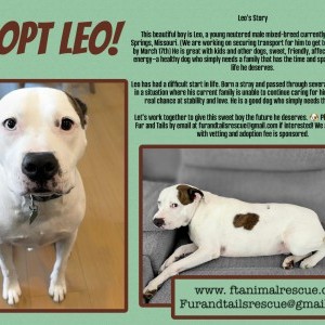 Urgent deadline: March 17 If you are able to help by fostering, adopting, pulling through your rescue, assisting with transport, or sharing Leo with your network, please reach out.